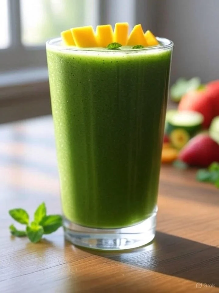 • 100 g Mango, 50 g Spinat, 100 ml Mandelmilch (ungesüßt), 30 g Proteinpulver (neutral), 1/2 Zitrone (Saft), 100 ml Wasser.