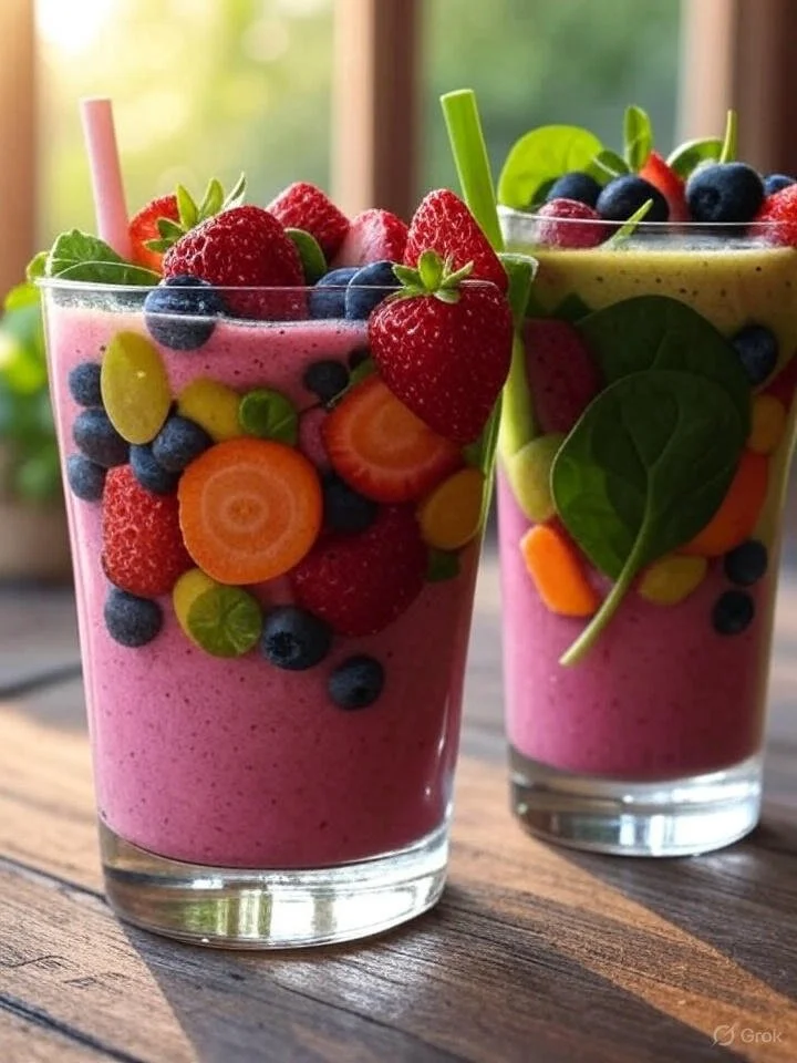 • 100 g Beeren (z. B. Heidelbeeren), 50 g Spinat, 100 ml Kokosmilch (ungesüßt), 30 g Proteinpulver (neutral), 1/2 Zitrone (Saft), 100 ml Wasser.